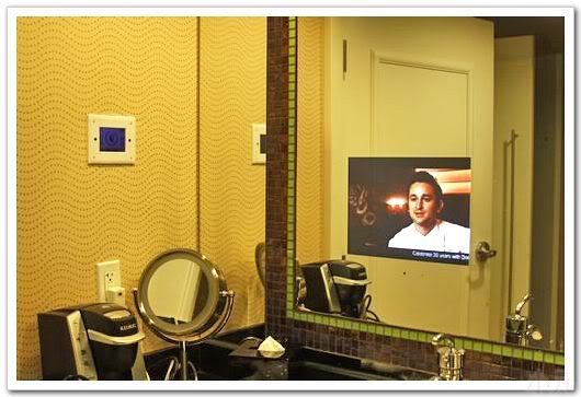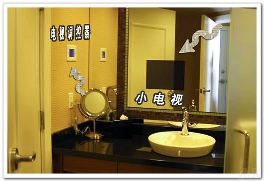 这是房间浴室,比较特别的是,镜内镶有小电视